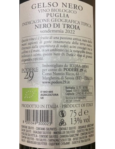 Il Gelso Nero di Podere29 è Nero di Troia biologico vinificato in purezza in acciaio.