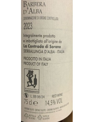 La Barbera Bosco di Contrada di Sorano prende il nome dal bosco che fiancheggia la vigna di Serralunga d'Alba e contribuisce a dare freschezza ad un vitigno che già di per sé spicca per acidità.