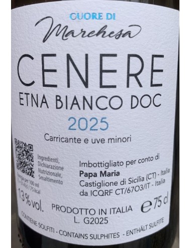 L'Etna Bianco di Cuore di Marchesa viene prodotto con uva Carricante più un mix di uve locali cresciute spontaneamente tra i filari. La maggior parte delle piante sono su piede franco.